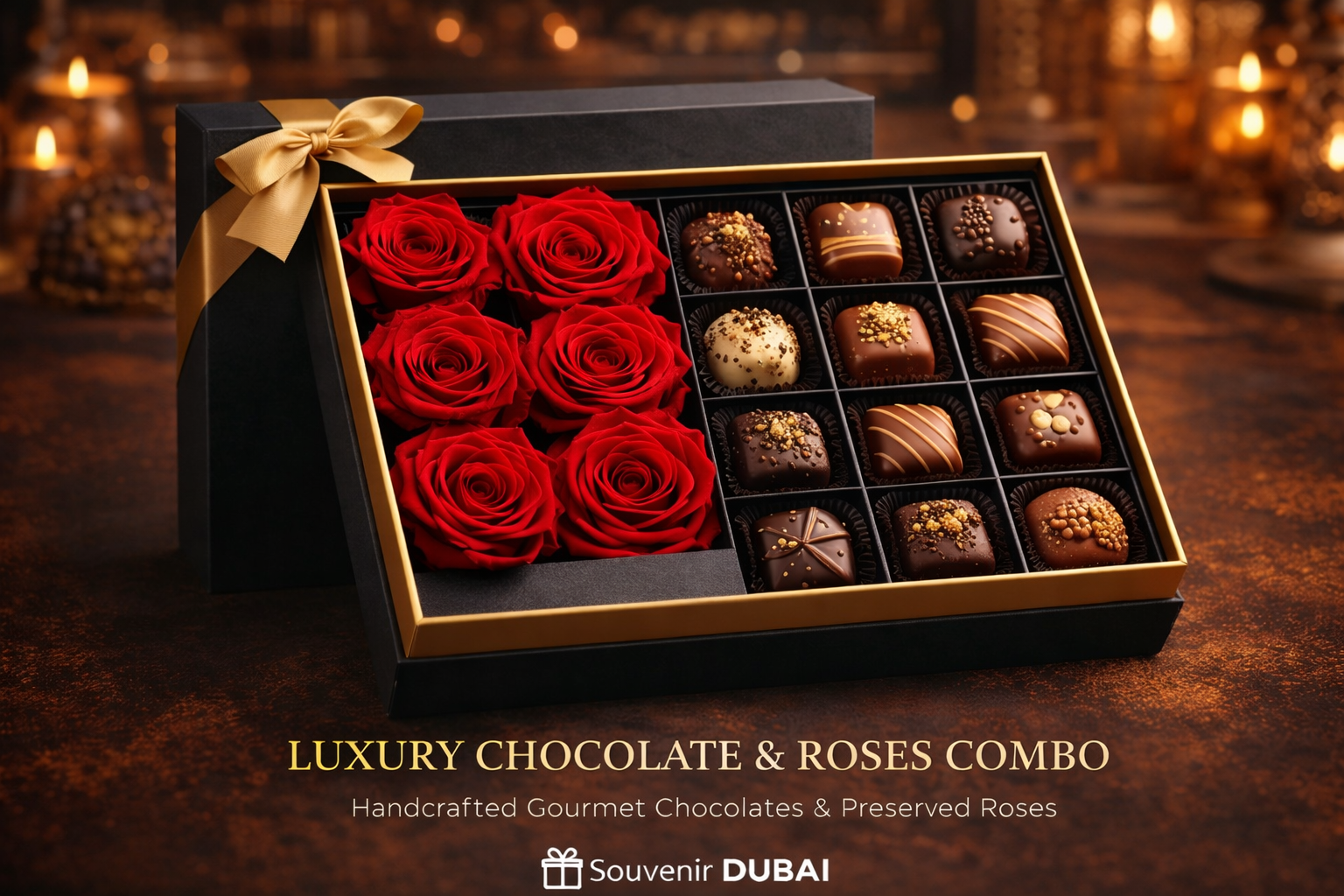 Buy Luxury Chocolate & Roses Combo from Souvenir Dubai, delivered across Dubai, Sharjah, and Abu Dhabi within a few hours. We deliver the finest Dubai souvenirs straight to your hotel, ensuring a smooth, fast, and premium gifting experience.